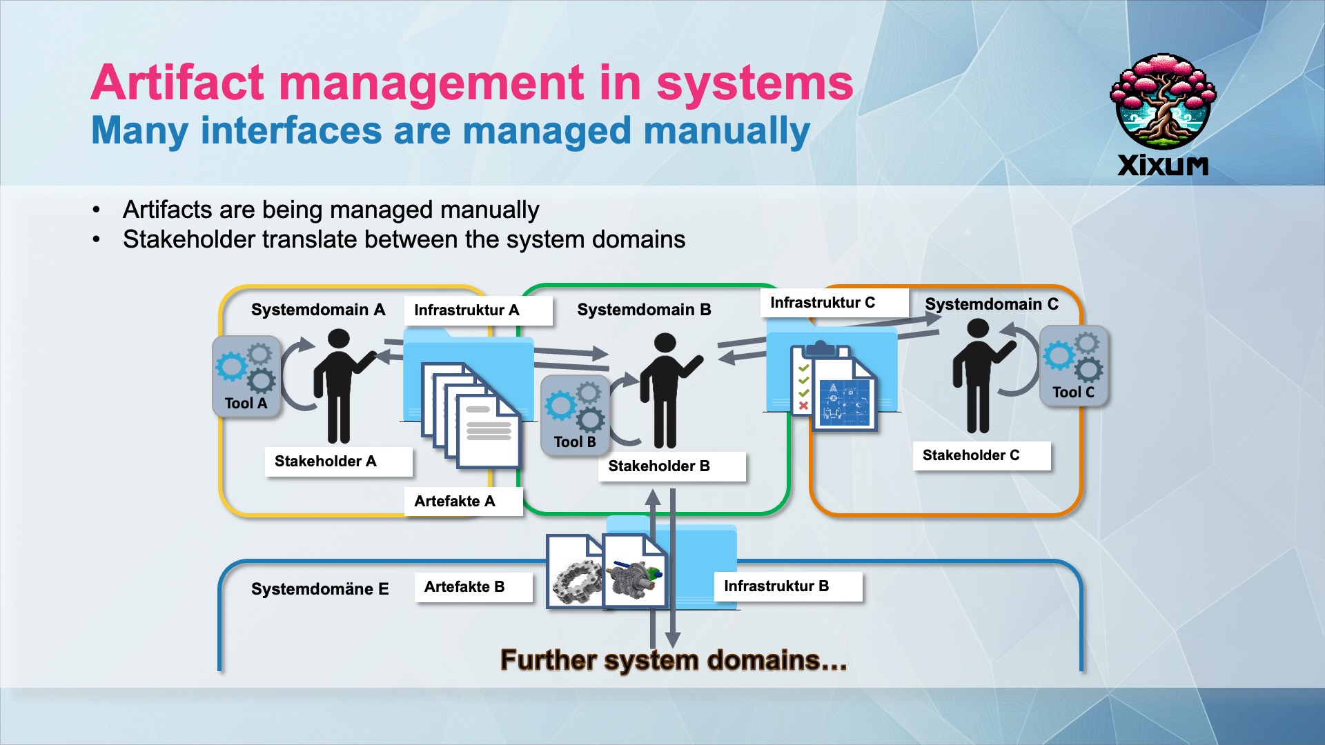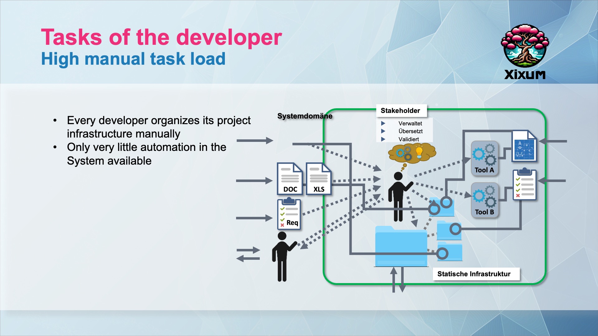 The core problem is missing data annotation. When dealing with software artifacts or documents they can only be interpreted by the stakeholder. Thus it Is the most important thing when you want to ease a production pipeline management that your data can be understood semantically by the machine